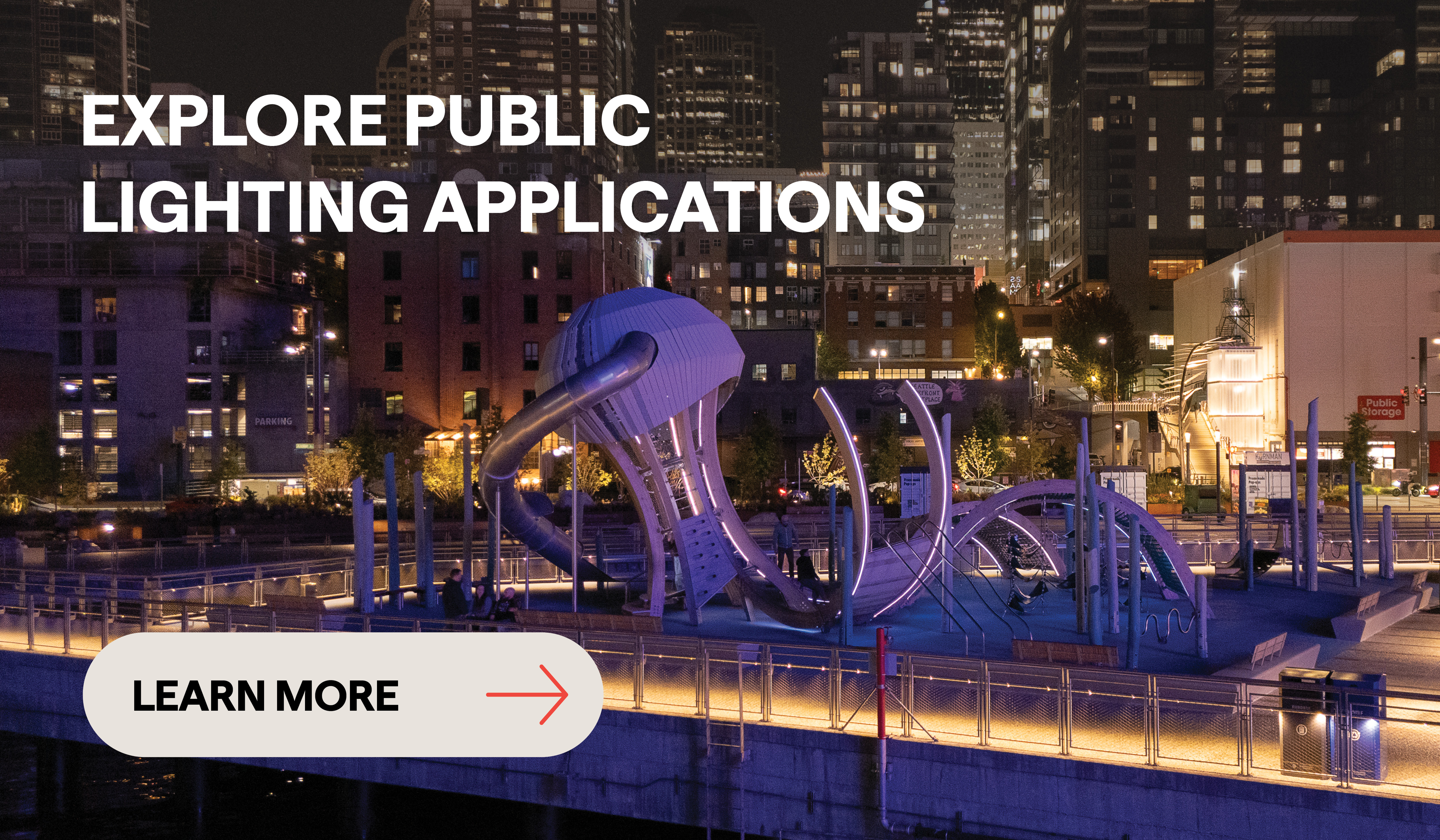 Welcome to Seattle’s Pier 58, the luminous result of the city’s $800 million investment that added 50,000 square feet of public space to the central waterfront. The star of the new sea-themed play area is a 25-foot-tall jellyfish climbing tower. The installation featuring swooping tentacles, climbable nets, 18-foot slide, and even a cluster of crab wobble boards, is a colorful example of urban lighting that helps kids reach new heights of delight.
