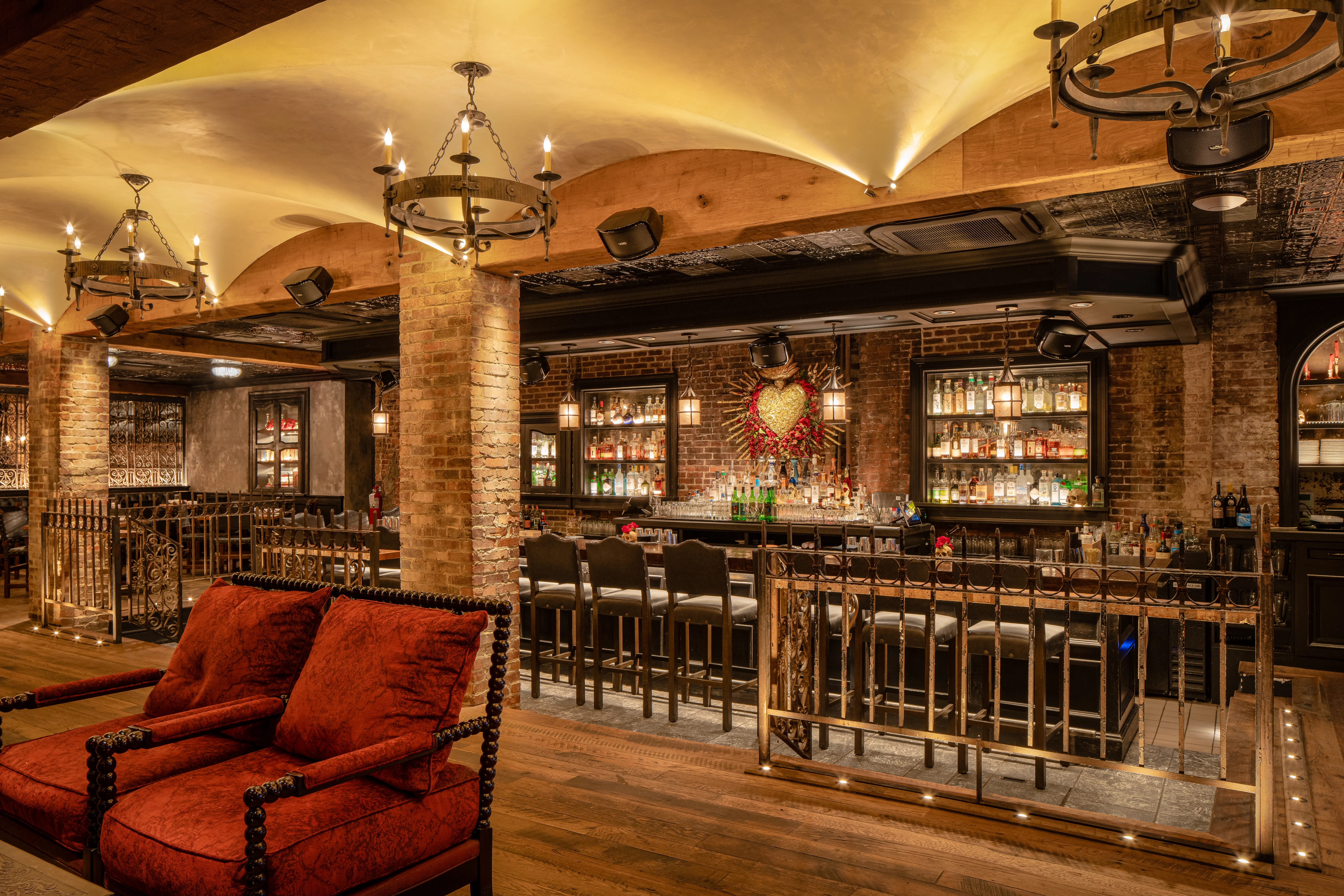 Lolita Back Bay embraces a gothic-style aesthetic with a mature audience in mind, offering a unique dining experience that breaks away from conventional restaurant interiors. Lighting throughout the venue is meticulously curated to enhance the gothic ambiance, highlighting key design elements and creating a captivating atmosphere for guests to savor culinary delights amidst timeless elegance.